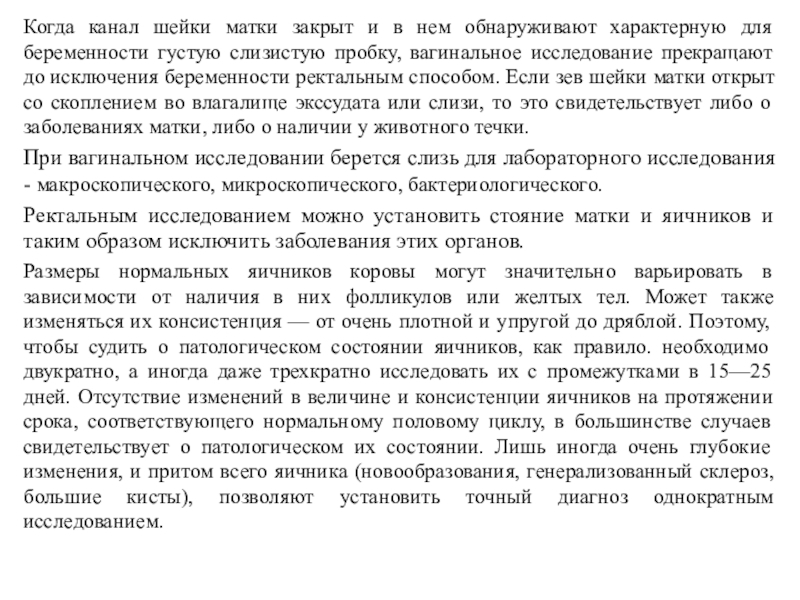 беременности густую слизистую пробку, вагинальное исследование прекращают до исключения беременности ректальным способом. Если зев шейки матки открыт со скоплением во влагалище экссудата или слизи, то это свидетельствует либо о заболеваниях матки, либо о наличии у животного течки.