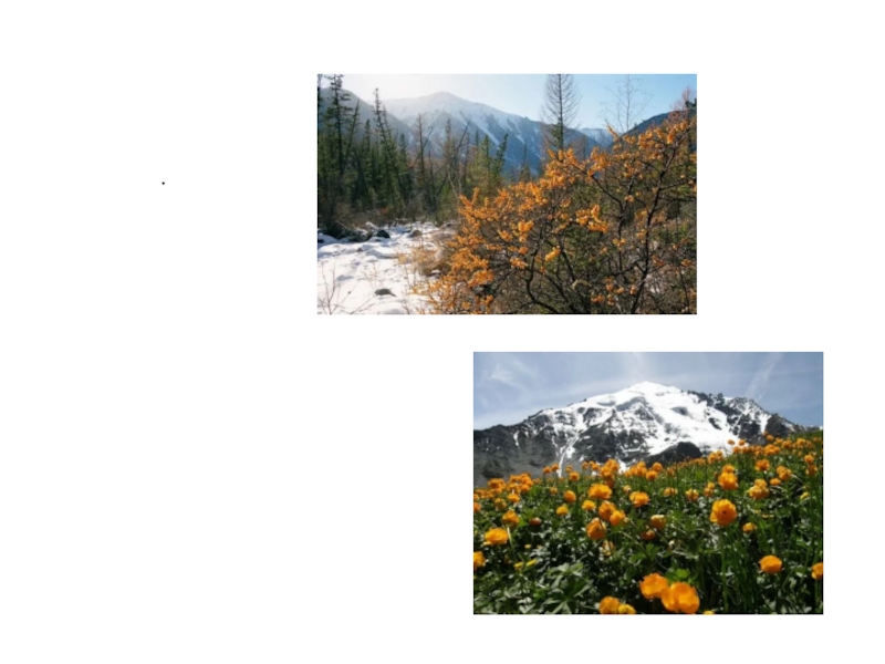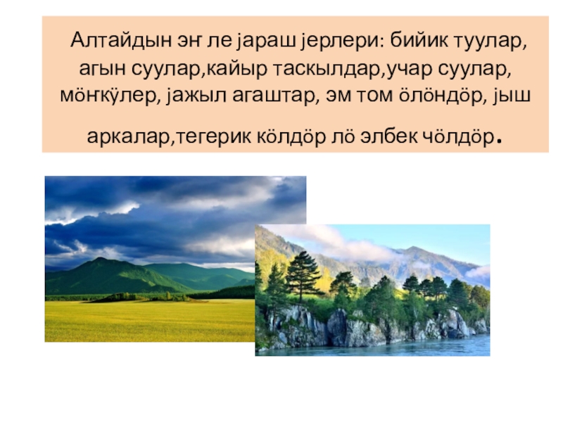 Слайд 4 Алтайдын эҥ ле jараш jерлери: бийик туулар, агын суулар,кайыр таскылдар,учар