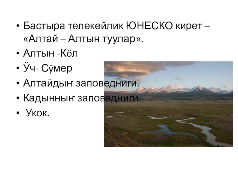 Слайд 15Бастыра телекейлик ЮНЕСКО кирет – «Алтай – Алтын туулар».