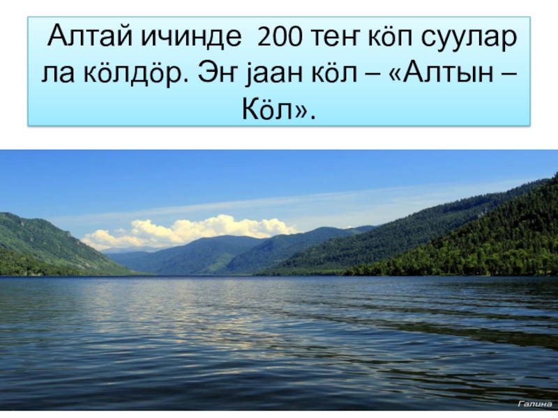 Слайд 8 Алтай ичинде 200 теҥ кöп суулар ла кöлдöр. Эҥ jаан