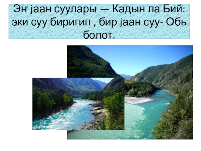 Слайд 7Эҥ jаан суулары — Кадын ла Бий: эки суу биригип ,