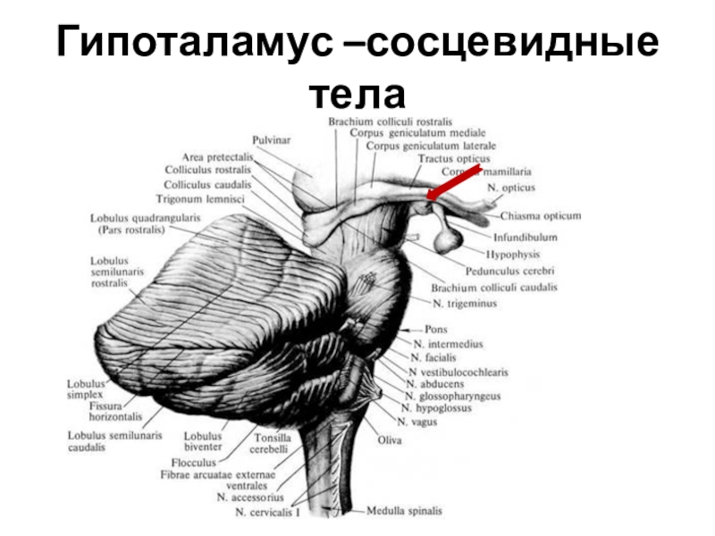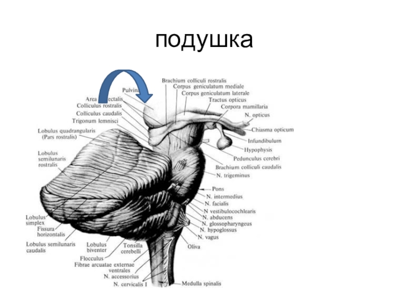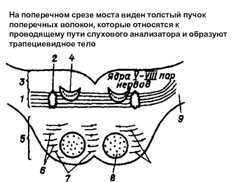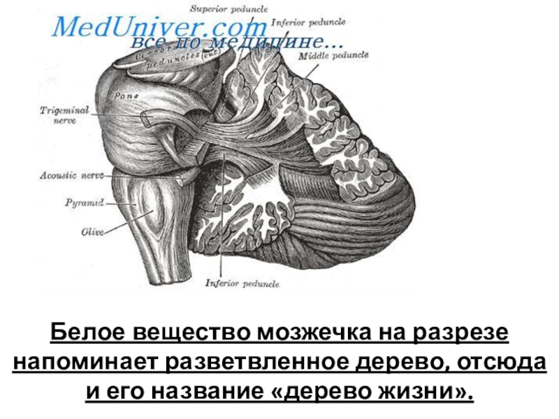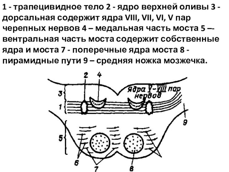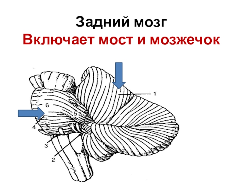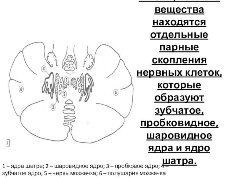 1 – ядра шатра; 2 – шаровидное ядро; 3 – пробковое ядро; 4 – зубчатое ядро; 5 – червь мозжечка; 6 – полушария мозжечка