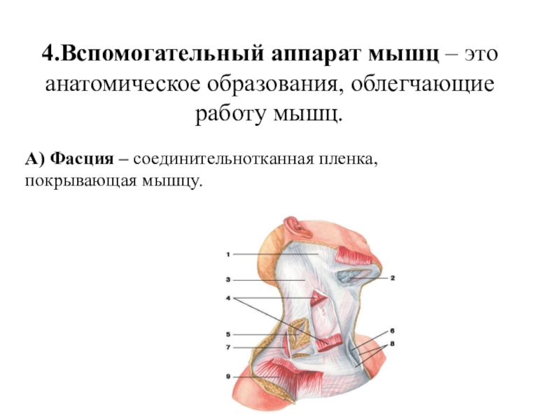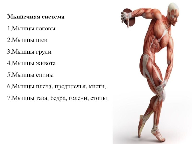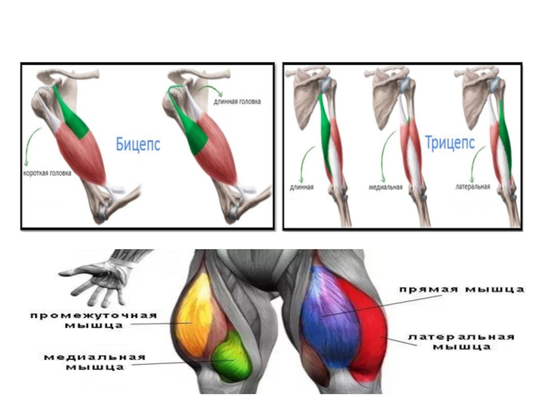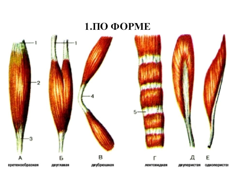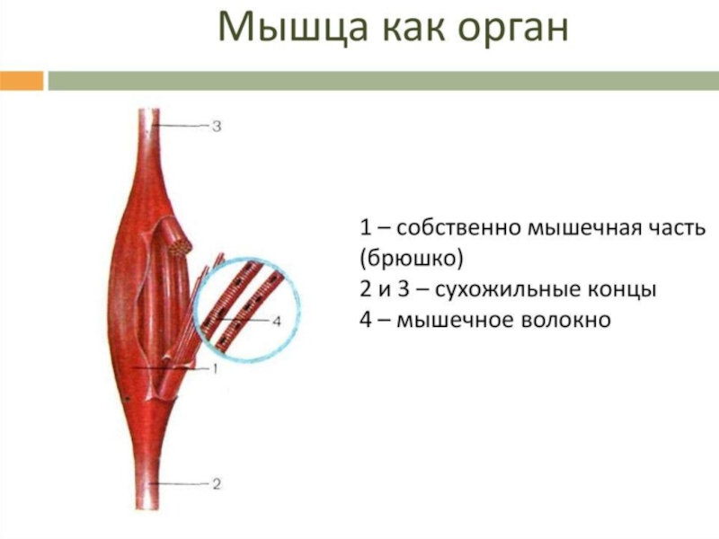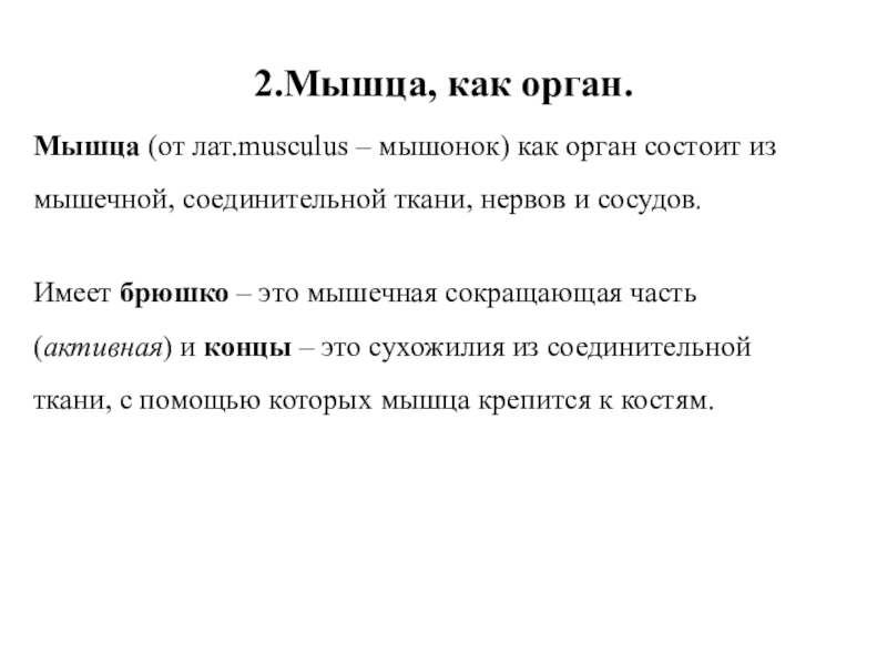 Имеет брюшко – это мышечная сокращающая часть (активная) и концы – это сухожилия из соединительной ткани, с помощью которых мышца крепится к костям.