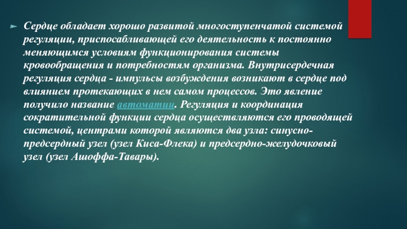 постоянно меняющимся условиям функционирования системы кровообращения и потребностям организма. Внутрисердечная регуляция сердца - импульсы возбуждения возникают в сердце под влиянием протекающих в нем самом процессов. Это явление получило название автоматии. Регуляция и координация сократительной функции сердца осуществляются его проводящей системой, центрами которой являются два узла: синусно-предсердный узел (узел Киса-Флека) и предсердно-желудочковый узел (узел Ашоффа-Тавары).