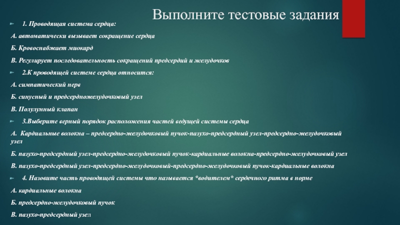 3.Выберите верный порядок расположения частей ведущей системы сердца