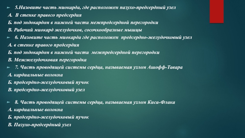 6. Назовите часть миокарда где расположен предсердно-желудочковый узел