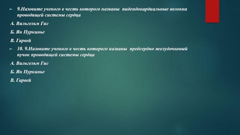 10. 9.Назовите ученого в честь которого названы предсердно желудочковый пучок проводящей системы сердца
