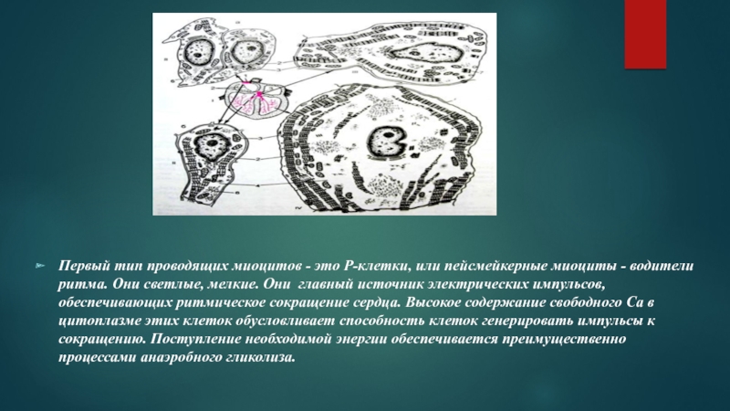 Слайд 7Первый тип проводящих миоцитов - это P-клетки, или пейсмейкерные миоциты -