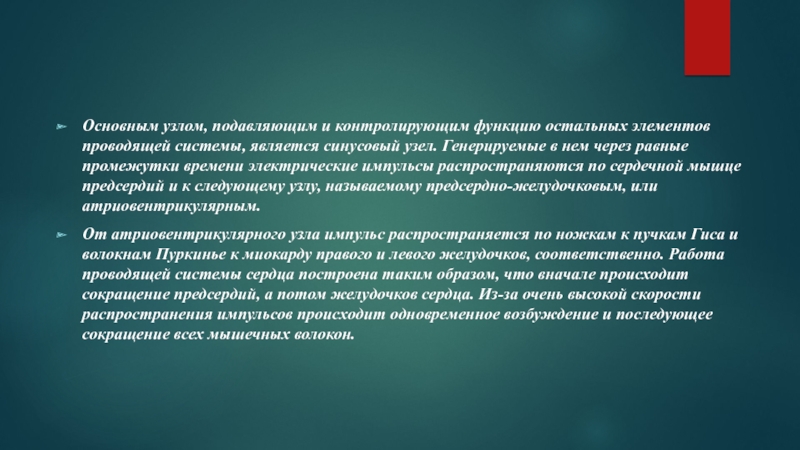 Слайд 10Основным узлом, подавляющим и контролирующим функцию остальных элементов проводящей системы, является