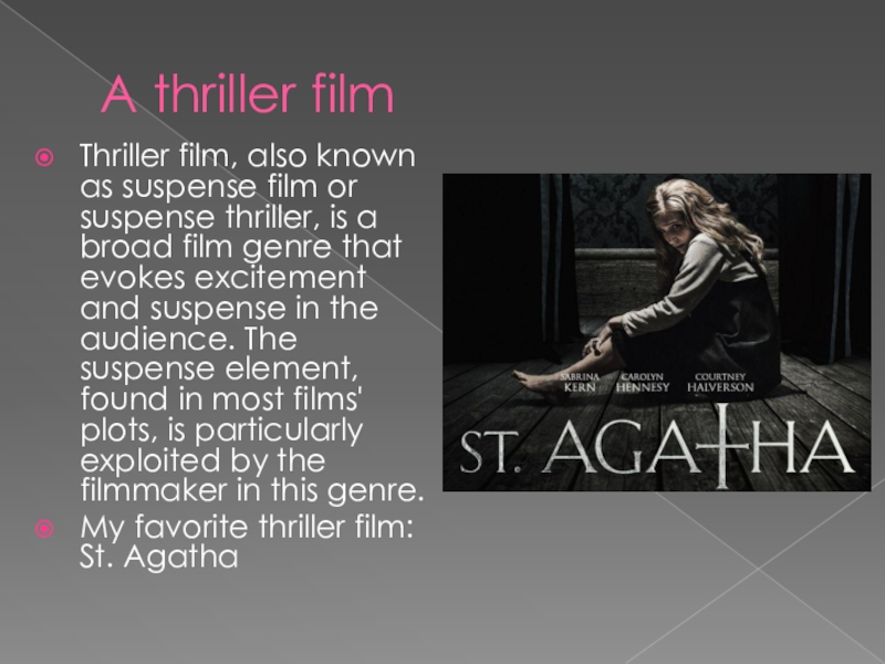 thriller, is a broad film genre that evokes excitement and suspense in the audience. The suspense element, found in most films' plots, is particularly exploited by the filmmaker in this genre.