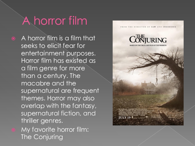 elicit fear for entertainment purposes. Horror film has existed as a film genre for more than a century. The macabre and the supernatural are frequent themes. Horror may also overlap with the fantasy, supernatural fiction, and thriller genres.