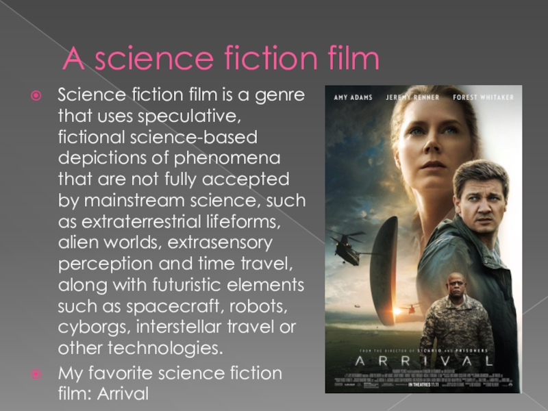 speculative, fictional science-based depictions of phenomena that are not fully accepted by mainstream science, such as extraterrestrial lifeforms, alien worlds, extrasensory perception and time travel, along with futuristic elements such as spacecraft, robots, cyborgs, interstellar travel or other technologies.