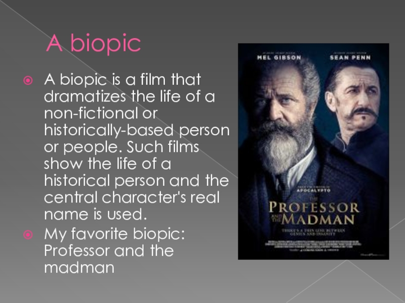 a non-fictional or historically-based person or people. Such films show the life of a historical person and the central character's real name is used.