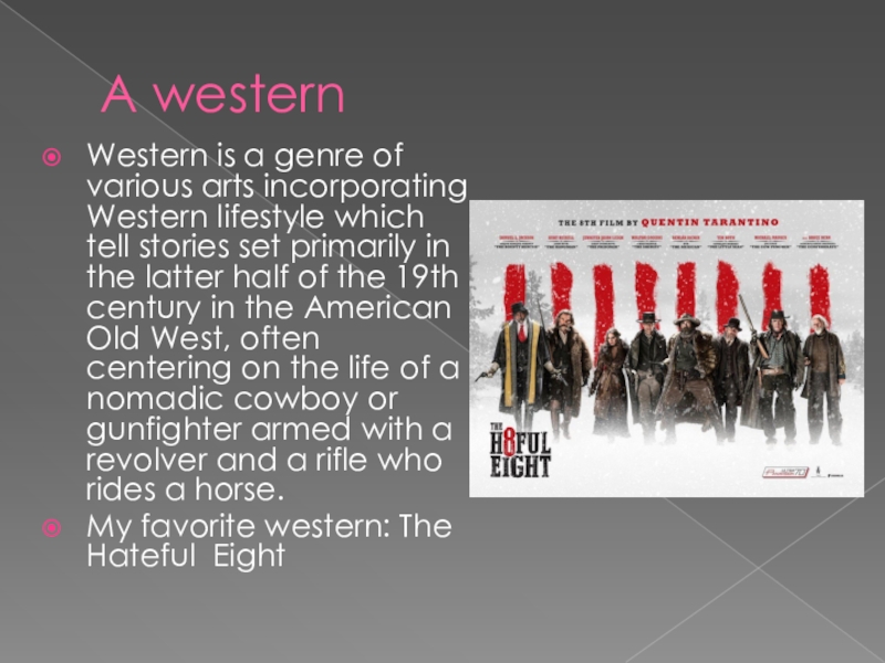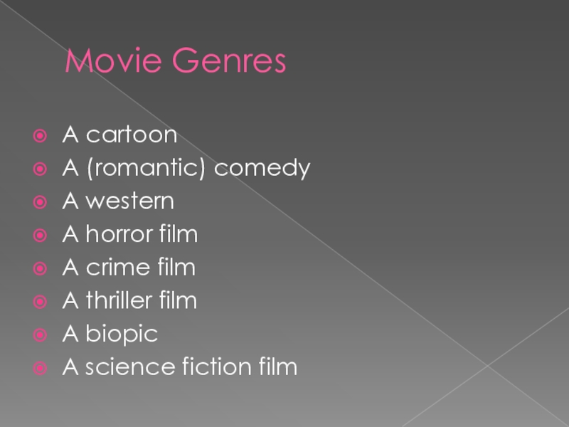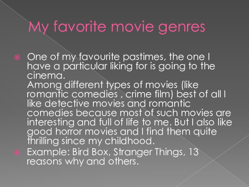 Among different types of movies (like romantic comedies , crime film) best of all I like detective movies and romantic comedies because most of such movies are interesting and full of life to me. But I also like good horror movies and I find them quite thrilling since my childhood.
