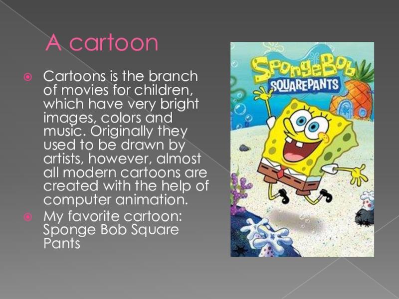 very bright images, colors and music. Originally they used to be drawn by artists, however, almost all modern cartoons are created with the help of computer animation.