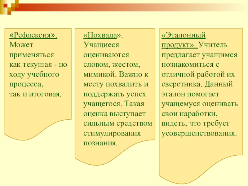 «Похвала». Учащиеся оцениваются словом, жестом, мимикой. Важно к месту похвалить и поддержать успех учащегося. Такая оценка выступает сильным средством стимулирования познания.