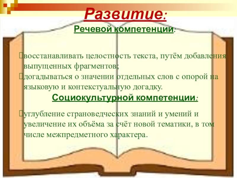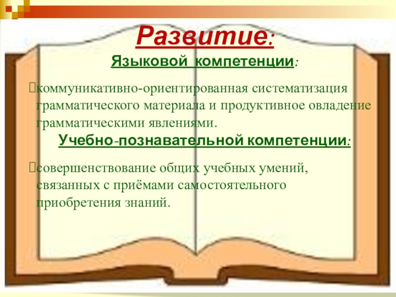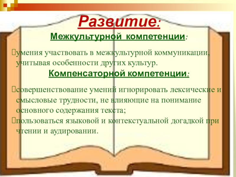 развитие коммуникативной компетенции (речевой, языковой, социокультурной, компенсаторной, учебно-познавательной).