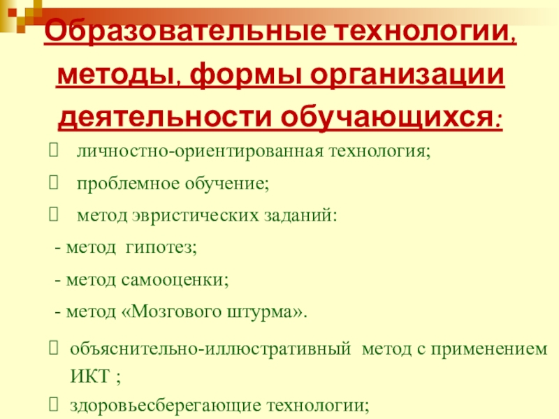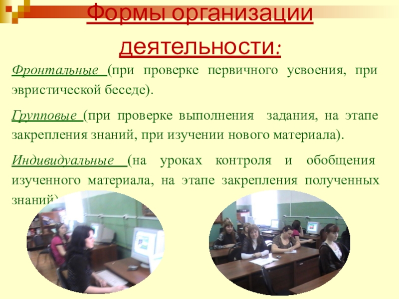 Фронтальные (при проверке первичного усвоения, при эвристической беседе).
