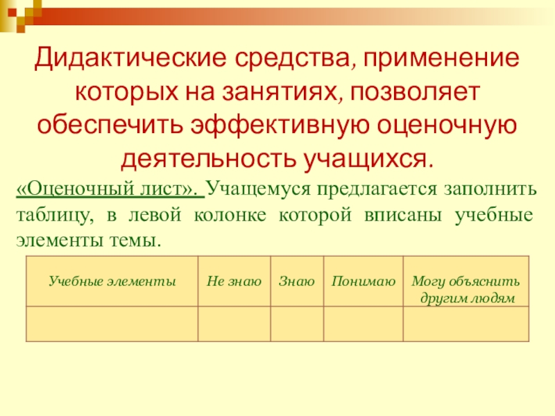 Слайд 25Дидактические средства, применение которых на занятиях, позволяет обеспечить эффективную оценочную деятельность
