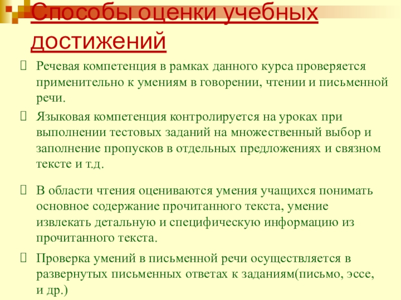 Проверка умений в письменной речи осуществляется в развернутых письменных ответах к заданиям(письмо, эссе, и др.)