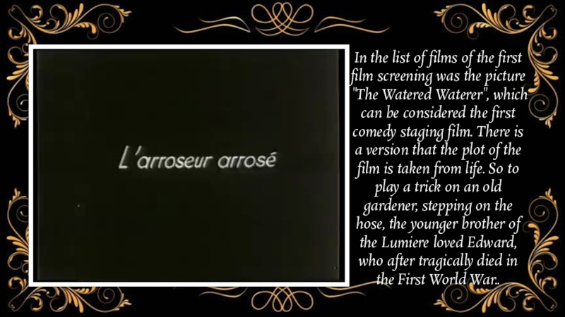 the picture "The Watered Waterer", which can be considered the first comedy staging film. There is a version that the plot of the film is taken from life. So to play a trick on an old gardener, stepping on the hose, the younger brother of the Lumiere loved Edward, who after tragically died in the First World War..