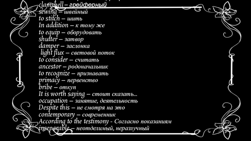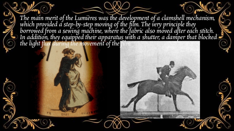 clamshell mechanism, which provided a step-by-step moving of the film. The very principle they borrowed from a sewing machine, where the fabric also moved after each stitch. In addition, they equipped their apparatus with a shutter, a damper that blocked the light flux during the movement of the film.