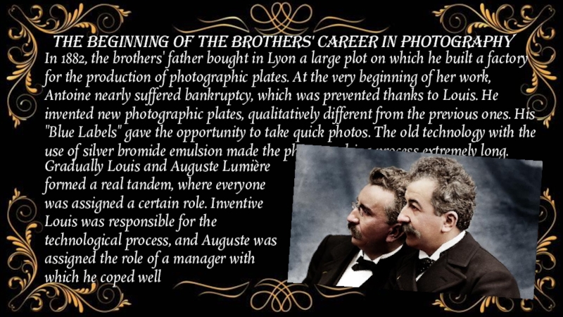 Gradually Louis and Auguste Lumière formed a real tandem, where everyone was assigned a certain role. Inventive Louis was responsible for the technological process, and Auguste was assigned the role of a manager with which he coped well