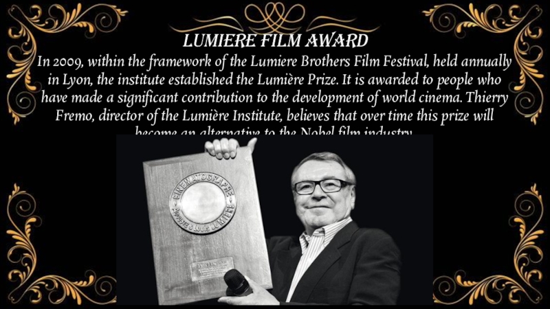Film Festival, held annually in Lyon, the institute established the Lumière Prize. It is awarded to people who have made a significant contribution to the development of world cinema. Thierry Fremo, director of the Lumière Institute, believes that over time this prize will become an alternative to the Nobel film industry.