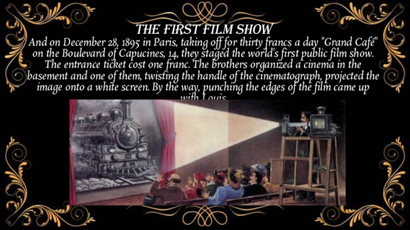taking off for thirty francs a day "Grand Café" on the Boulevard of Capucines, 14, they staged the world's first public film show. The entrance ticket cost one franc. The brothers organized a cinema in the basement and one of them, twisting the handle of the cinematograph, projected the image onto a white screen. By the way, punching the edges of the film came up with Louis