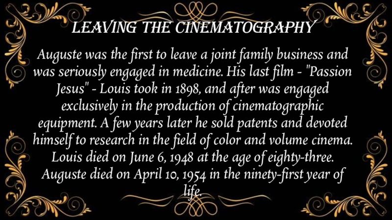 business and was seriously engaged in medicine. His last film - "Passion Jesus" - Louis took in 1898, and after was engaged exclusively in the production of cinematographic equipment. A few years later he sold patents and devoted himself to research in the field of color and volume cinema.