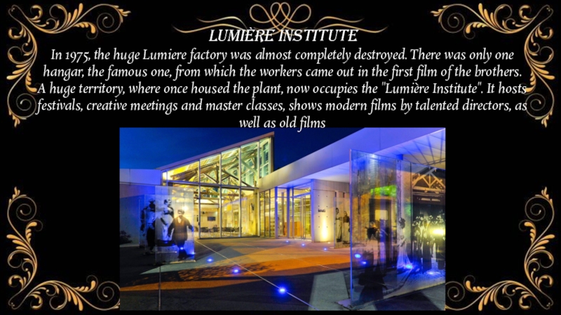 A huge territory, where once housed the plant, now occupies the "Lumière Institute". It hosts festivals, creative meetings and master classes, shows modern films by talented directors, as well as old films