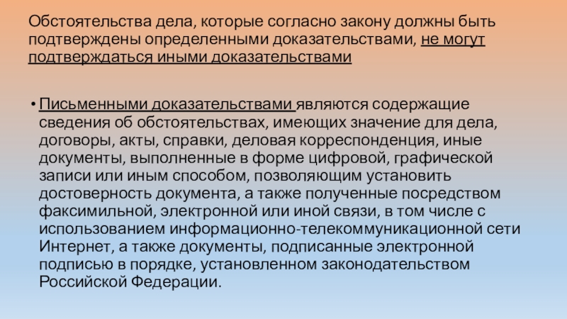 Слайд 12Обстоятельства дела, которые согласно закону должны быть подтверждены определенными доказательствами, не
