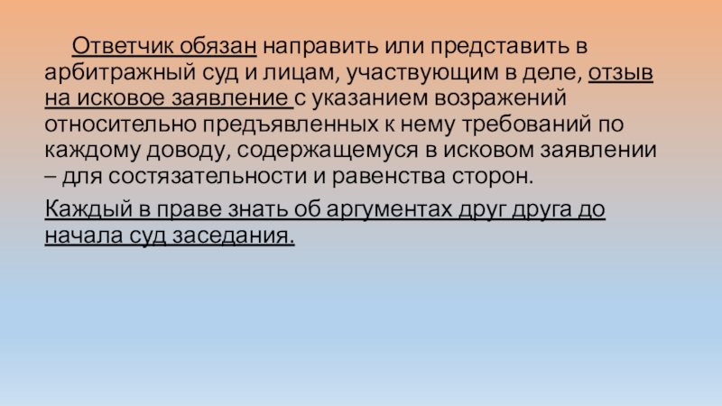 Слайд 8 Ответчик обязан направить или представить в арбитражный суд и лицам, участвующим