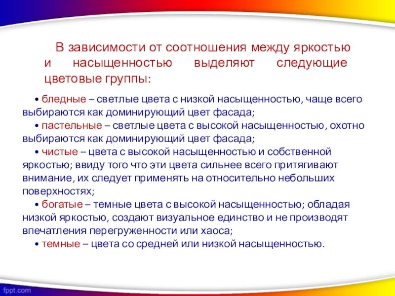 В зависимости от соотношения между яркостью и насыщенностью выделяют следующие цветовые группы: