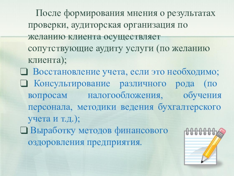 После формирования мнения о результатах проверки, аудиторская организация по желанию клиента осуществляет сопутствующие аудиту услуги