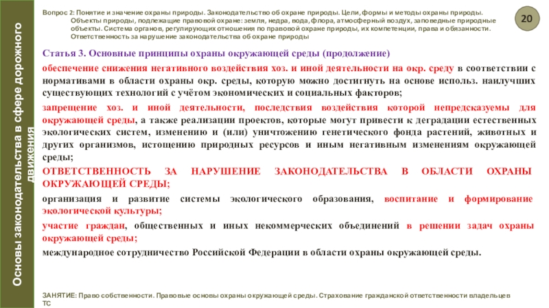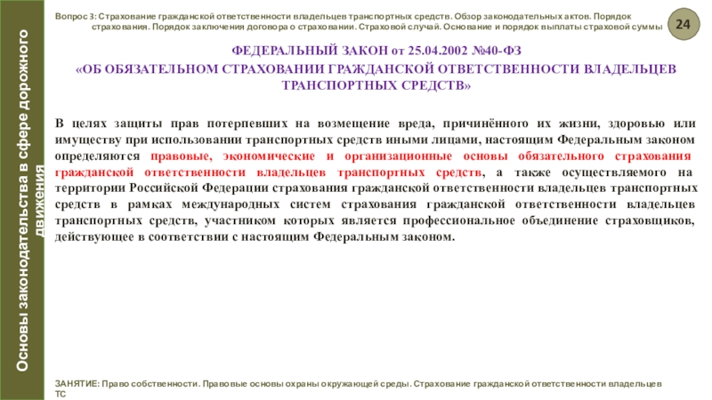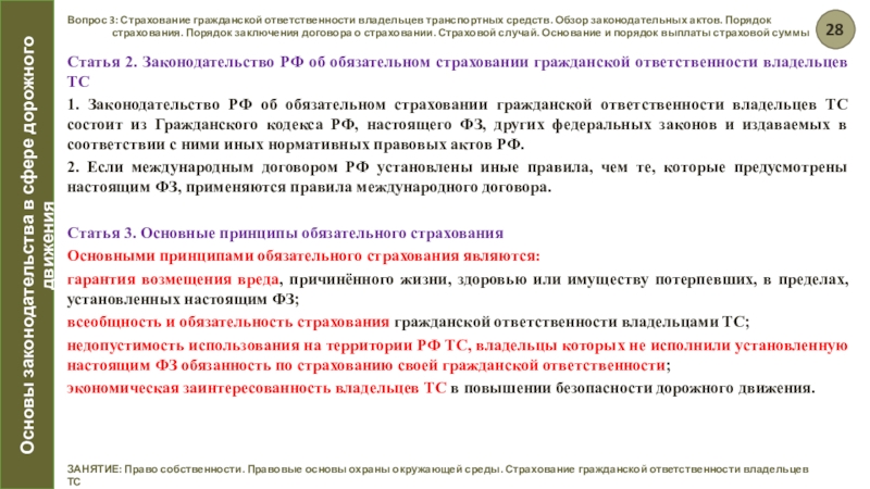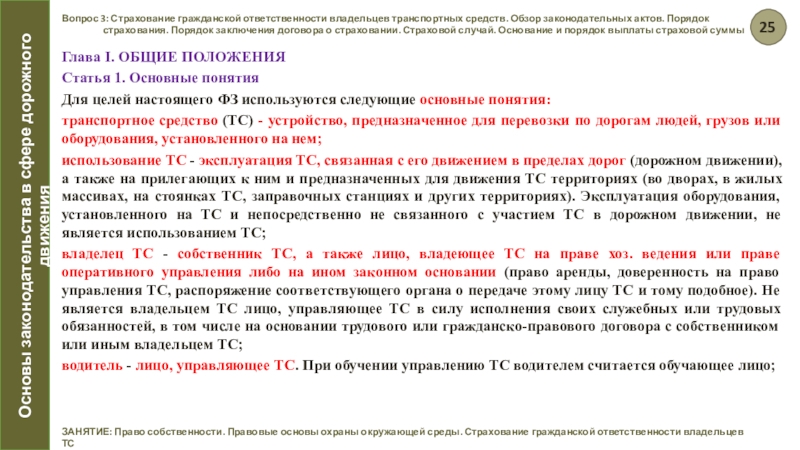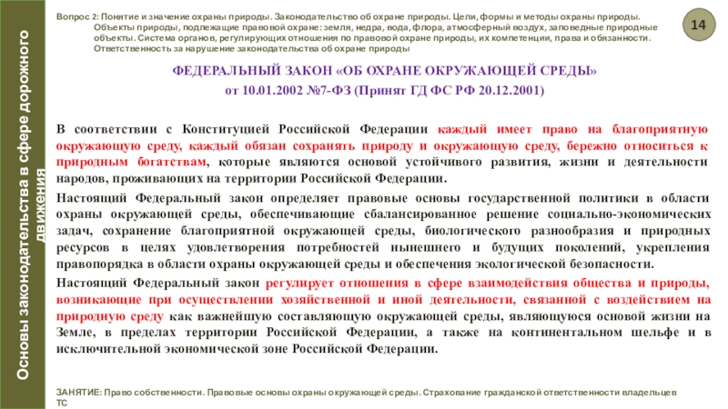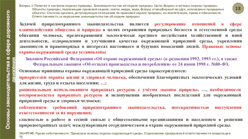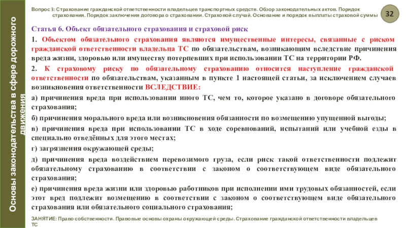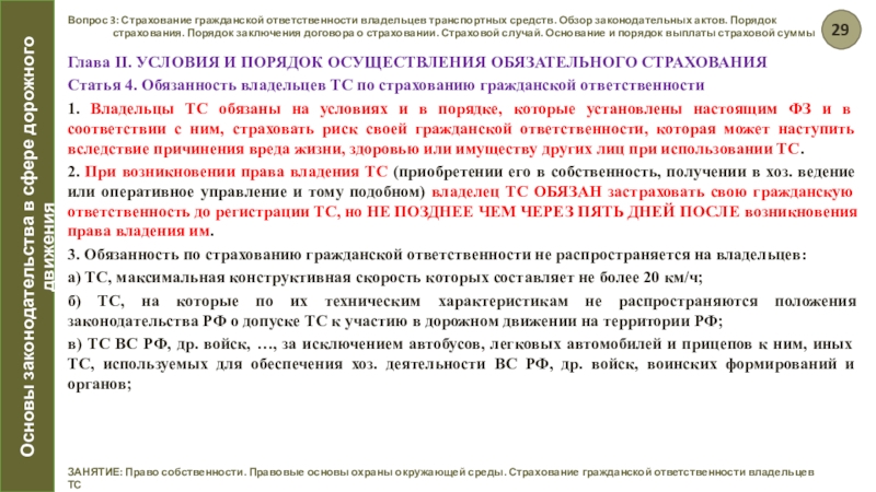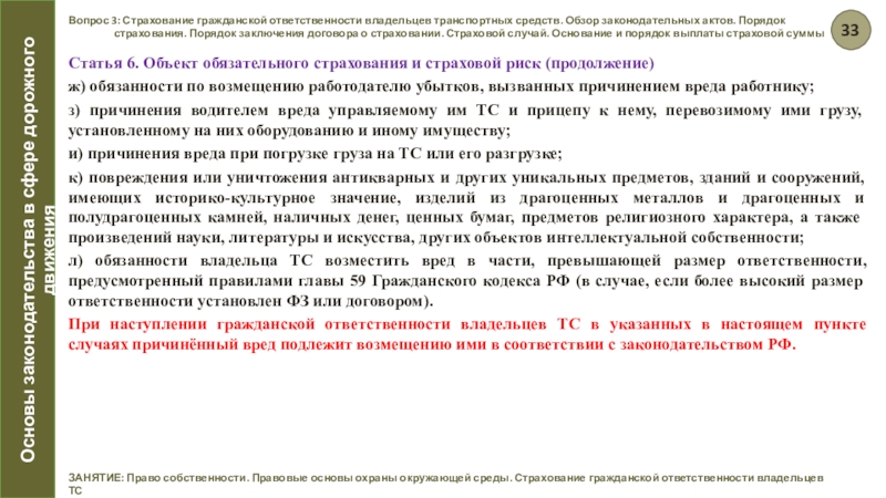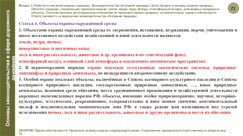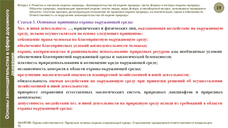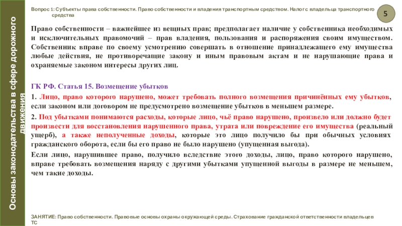 ЗАНЯТИЕ: Право собственности. Правовые основы охраны окружающей среды. Страхование гражданской ответственности владельцев ТС