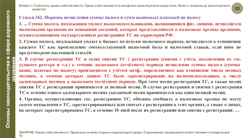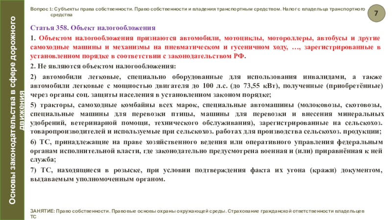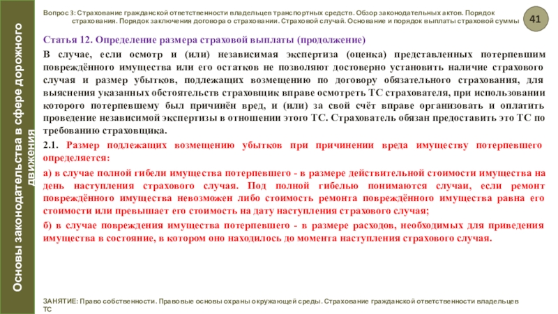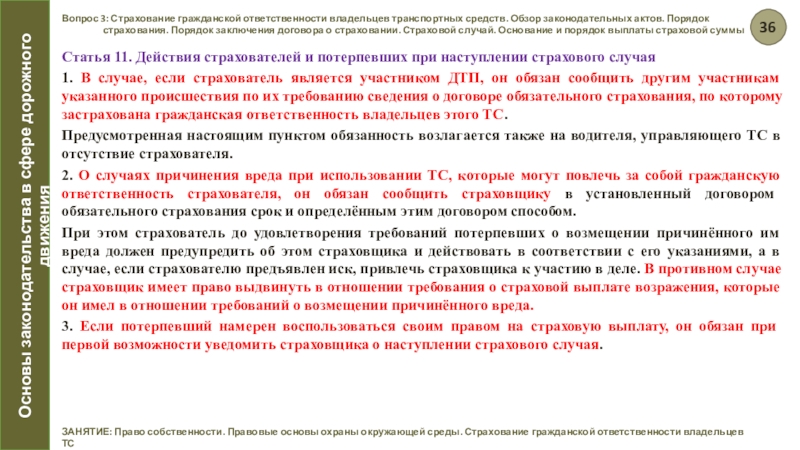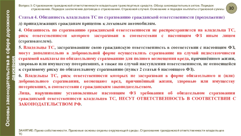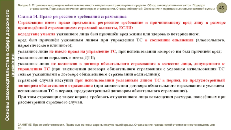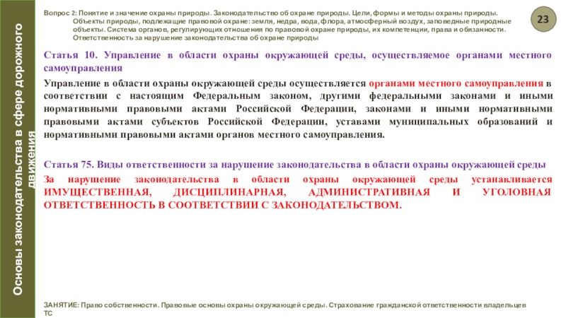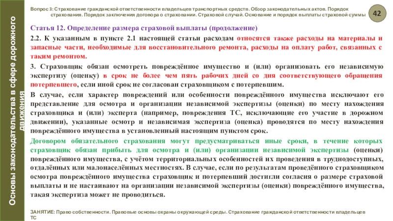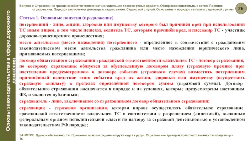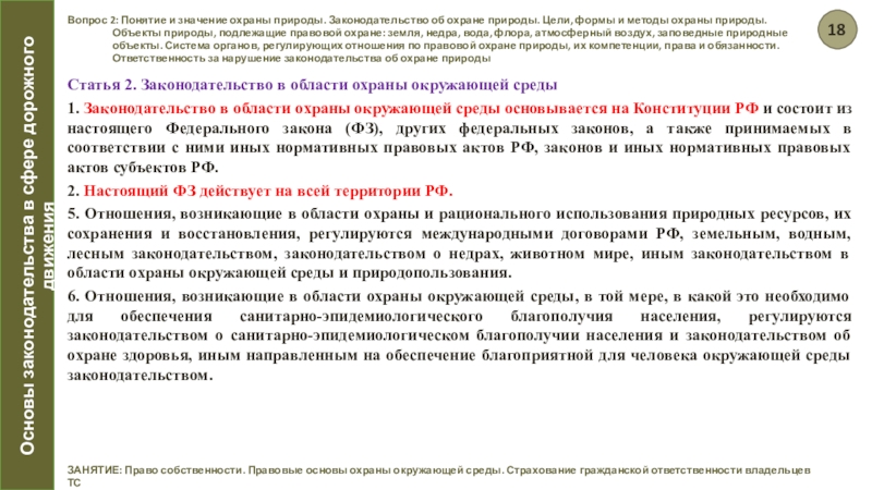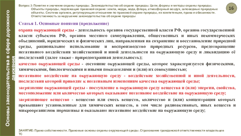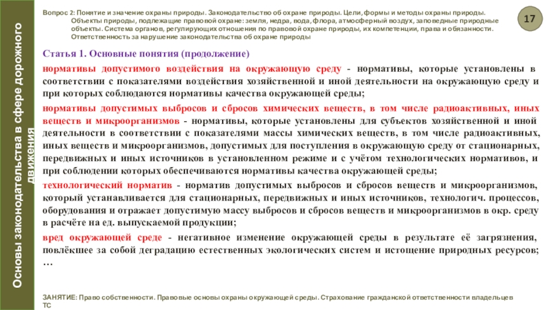 ЗАНЯТИЕ: Право собственности. Правовые основы охраны окружающей среды. Страхование гражданской ответственности владельцев ТС