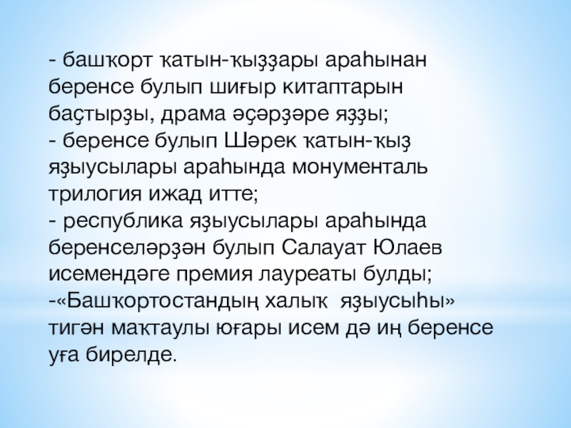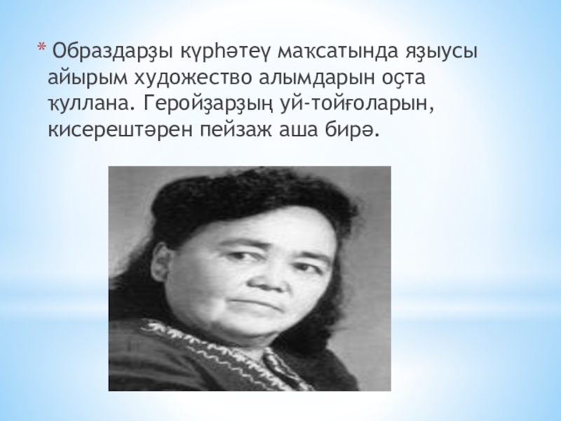 Слайд 3- башҡорт ҡатын-ҡыҙҙары араһынан беренсе булып шиғыр китаптарын баҫтырҙы, драма әҫәрҙәре