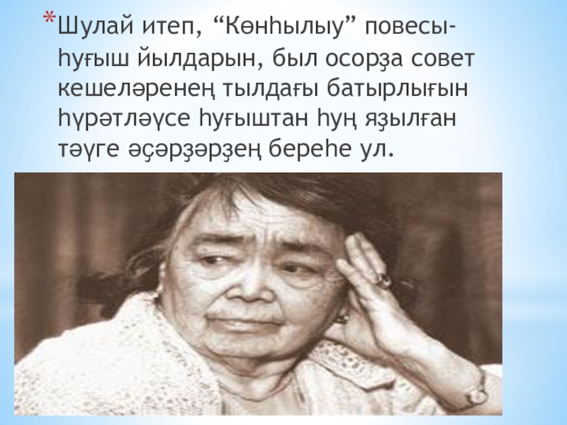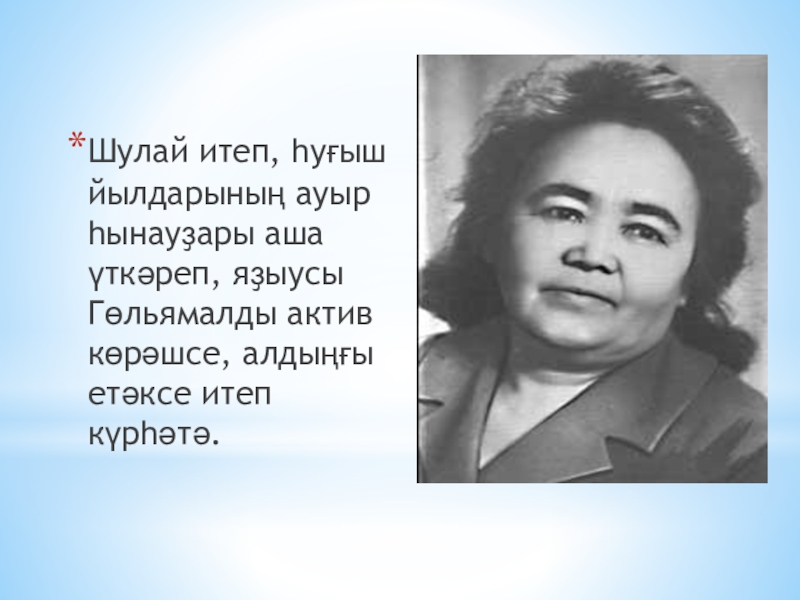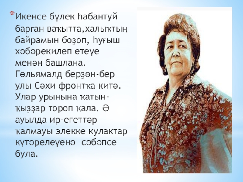 Слайд 21Шулай итеп, һуғыш йылдарының ауыр һынауҙары аша үткәреп, яҙыусы Гөльямалды актив