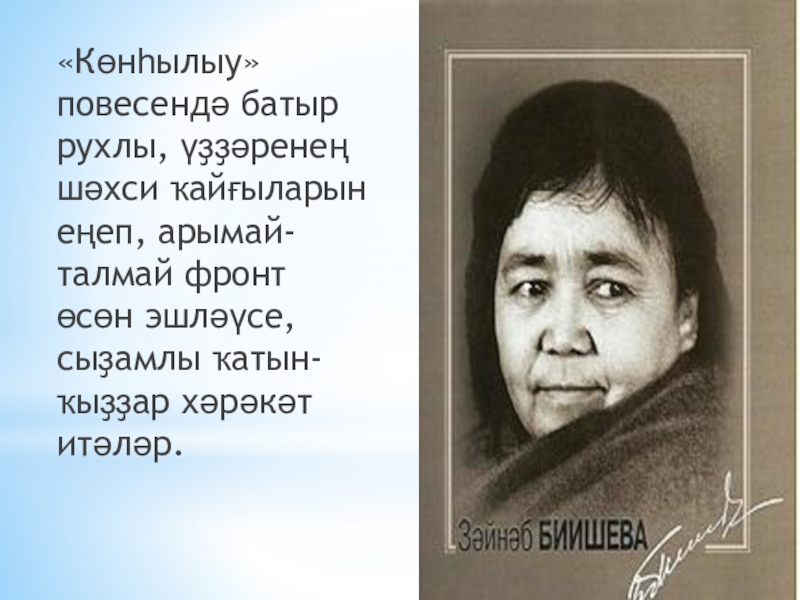 Слайд 1Зәйнәб Биишева ижадында ҡатын-ҡыҙ образы