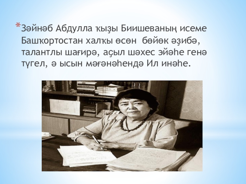 Слайд 2Зәйнәб Абдулла ҡыҙы Биишеваның исеме Башҡортостан халҡы өсөн бөйөк әҙибә, талантлы