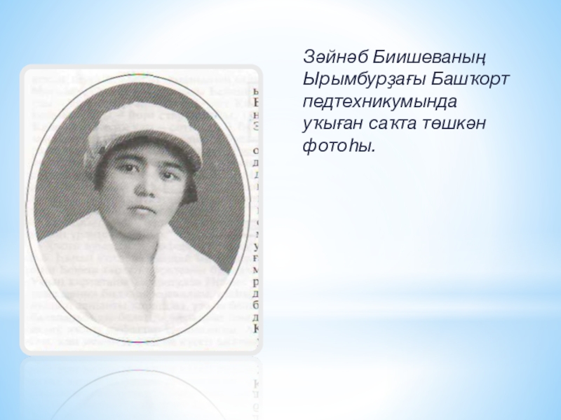 Слайд 4Зәйнәб Биишеваның Ырымбурҙағы Башҡорт педтехникумында уҡыған саҡта төшкән фотоһы.