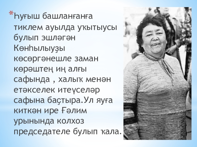 Слайд 10Һуғыш башланғанға тиклем ауылда уҡытыусы булып эшләгән Көнһылыуҙы көсөргәнешле заман көрәштең