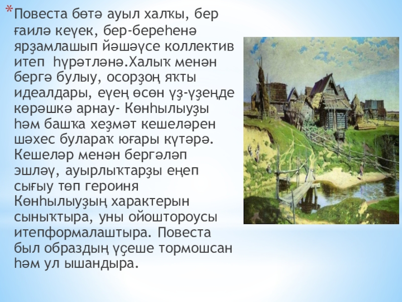 Слайд 13Повеста бөтә ауыл халҡы, бер ғаилә кеүек, бер-береһенә ярҙамлашып йәшәүсе коллектив