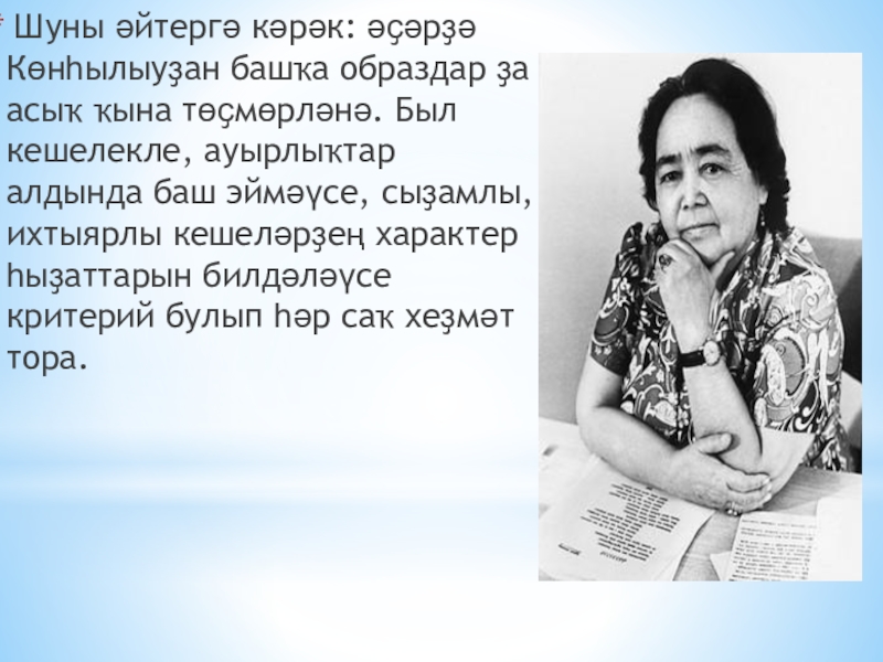 Презентация, доклад по башкирскому яз Образ женщины в тв-ве З.Биишевой 7кл