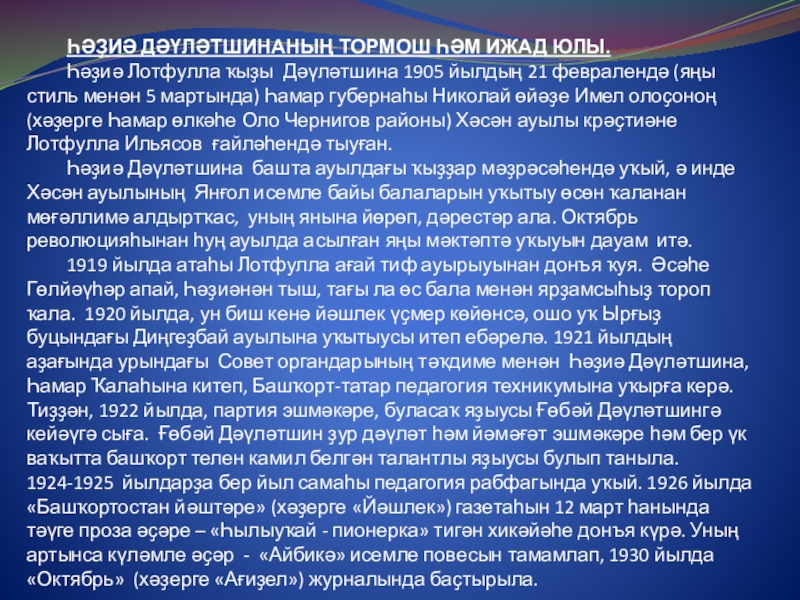 Слайд 2 ҺӘҘИӘ ДӘҮЛӘТШИНАНЫҢ ТОРМОШ ҺӘМ ИЖАД ЮЛЫ.