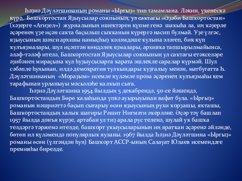 Слайд 7 Һәҙиә Дәүләтшинаның романы «Ырғыҙ» тип тамамлана.