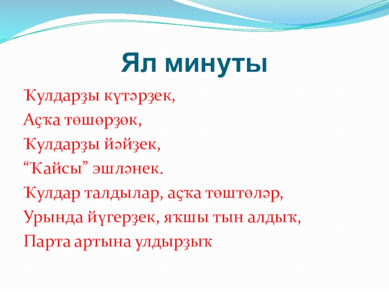 Ял минутыҠулдарҙы күтәрҙек,Аҫҡа төшөрҙөк,Ҡулдарҙы йәйҙек,“Ҡайсы” эшләнек.Ҡулдар талдылар, аҫҡа төштөләр,Урында йүгерҙек, яҡшы тын алдыҡ,Парта артына улдырҙыҡ