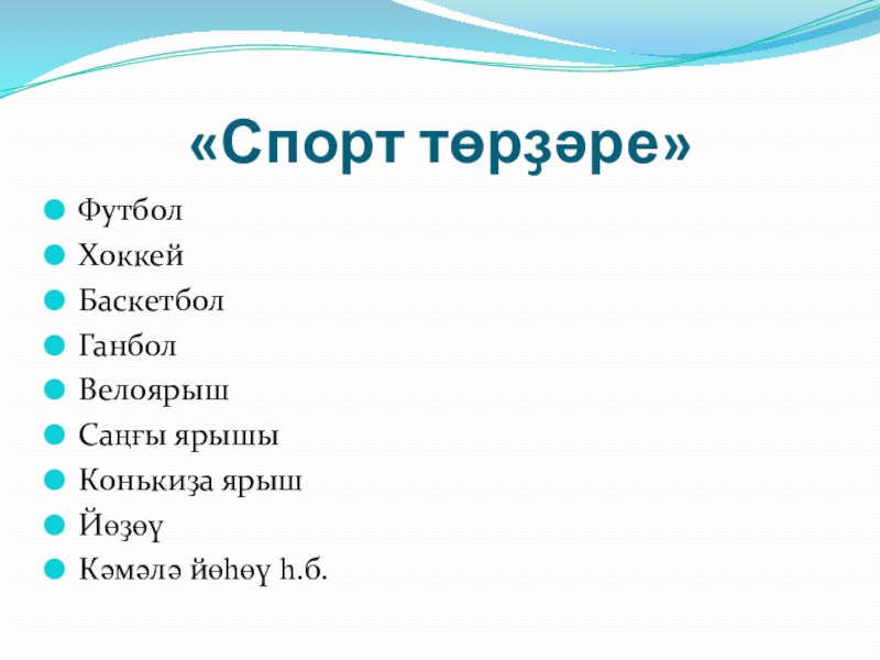 «Спорт төрҙәре»ФутболХоккейБаскетболГанболВелоярышСаңғы ярышыКонькиҙа ярышЙөҙөүКәмәлә йөһөү һ.б.