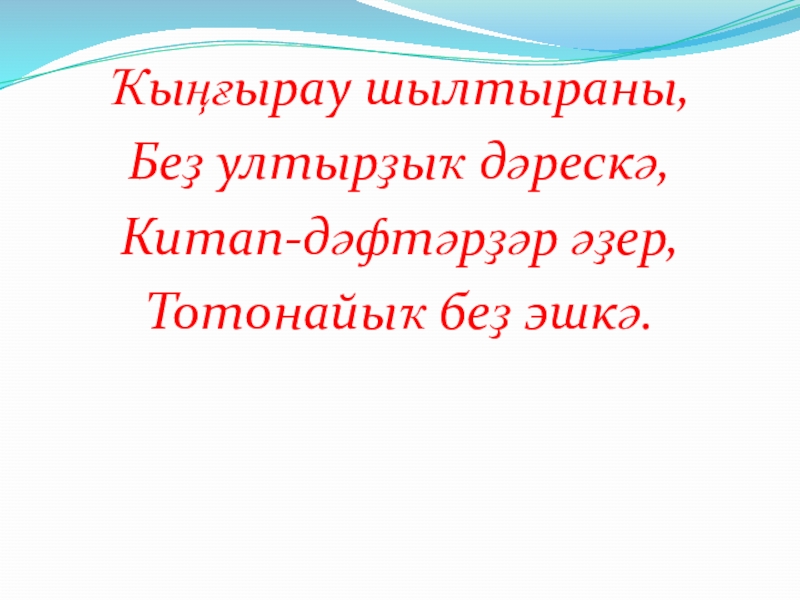 Ҡыңғырау шылтыраны, Беҙ ултырҙыҡ дәрескә,Китап-дәфтәрҙәр әҙер,Тотонайыҡ беҙ эшкә.